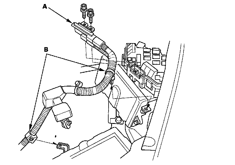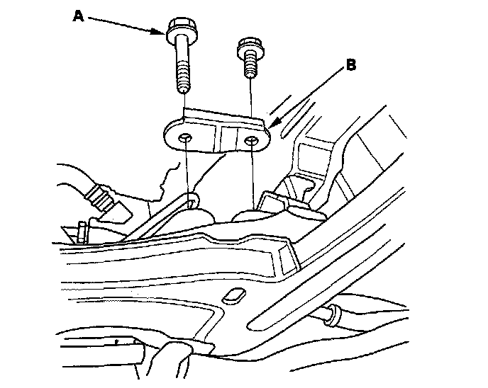 19. Remove the engine hanger plate and bolt (A), then install the ground cable (B).
