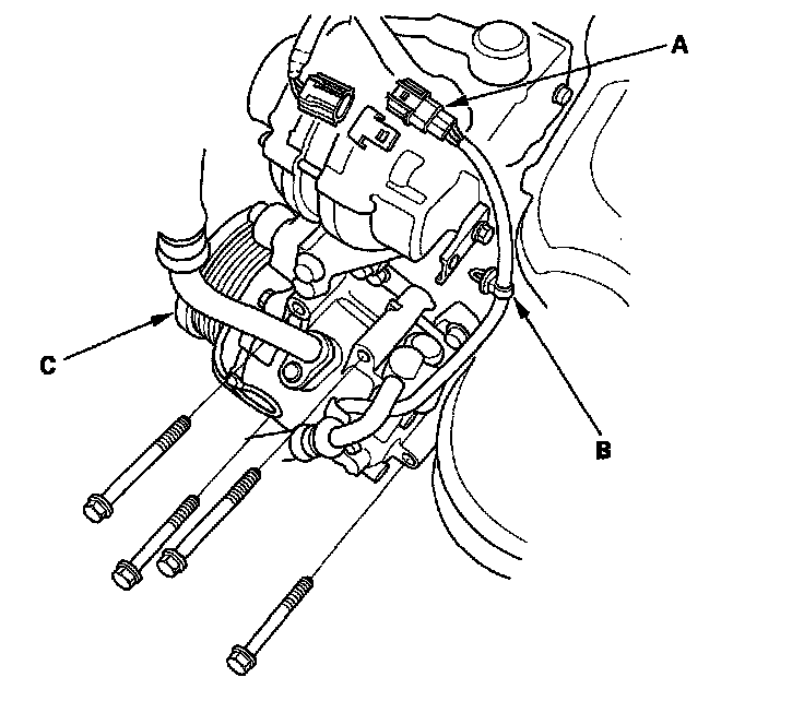 10. Remove the vacuum hose (A), brake booster vacuum hose (B), and power steering (P/S) hose clamp (C).