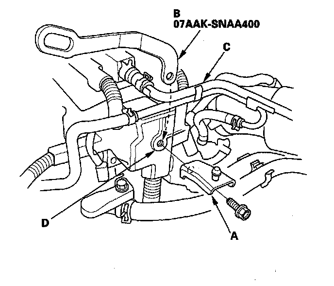 39. Remove the air cleaner housing mounting bracket (A), and install 1.8 support eyelet (B) behind the breather pipe (C) and down to the threaded hole (D) on the cylinder head.