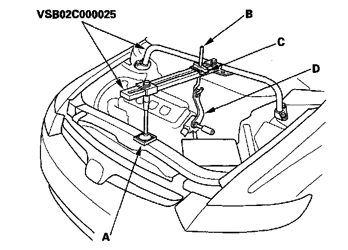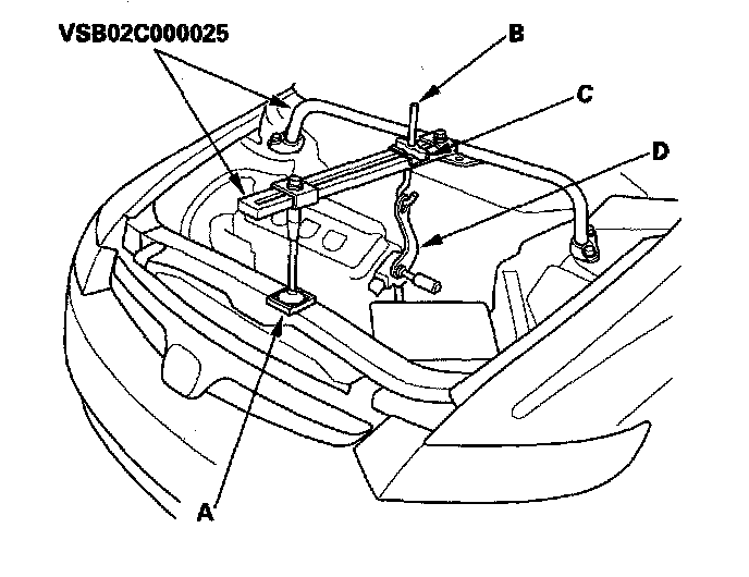 42. Install the front leg assembly (A), hook (B), and wing nut (C) from an A and Reds engine support hanger (AAR-T-12566) onto the 2006 Civic engine hanger. Carefully position the 2006 Civic engine hanger on the vehicle, and attach the hook to the slotted hole in the 1.8 support eyelet (D). Tighten the wing nut by hand to lift and support the engine/transmission assembly.