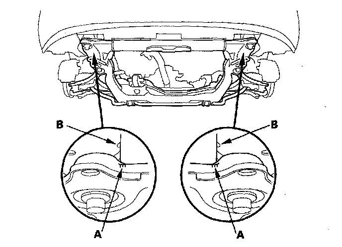13. Align the front subframe reference marks (A) to the body (B), as noted during removal. Tighten the subframe mounting bolts to the specified torque.