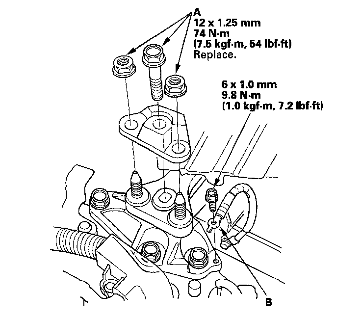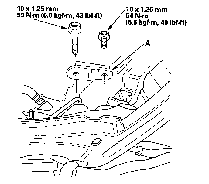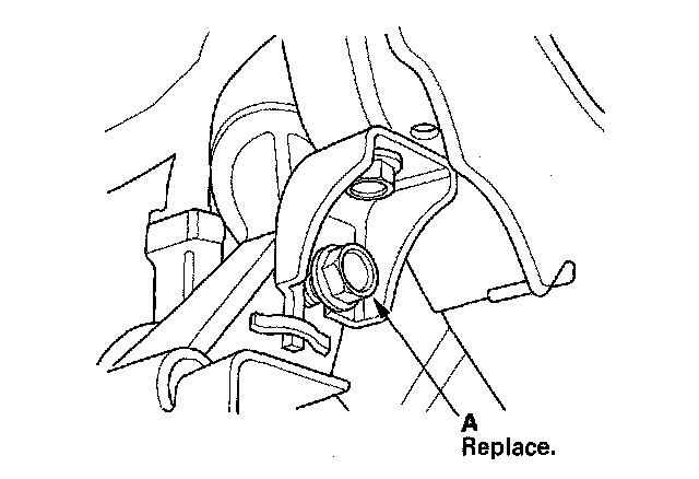 8. Tighten the new transmission mounting bolt and nuts (A).