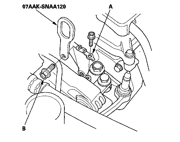 4. Attach the 1.8 support eyelet (A) to the cylinder head with the 1.8 support bolt (B). Tighten the bolt by hand.