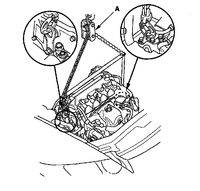 2. Position the engine/transmission assembly under the vehicle. Be sure that they are properly aligned. Carefully lower the vehicle until the engine and transmission are properly positioned in the engine compartment. Make sure the vehicle is not resting on any part of the engine or transmission. Lift and support the engine with a chain hoist (A) and carefully raise the engine/transmission assembly into place.