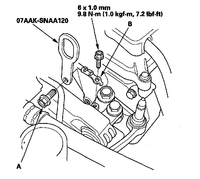 40. Attach the 1.8 support eyelet (A) to the cylinder head with the 1.8 support bolt (B). Tighten the bolt by hand.