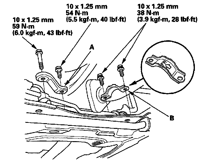 24. Install the power steering (P/S) line on the clamp (A), then install the P/S line brackets (B) on the subframe.
