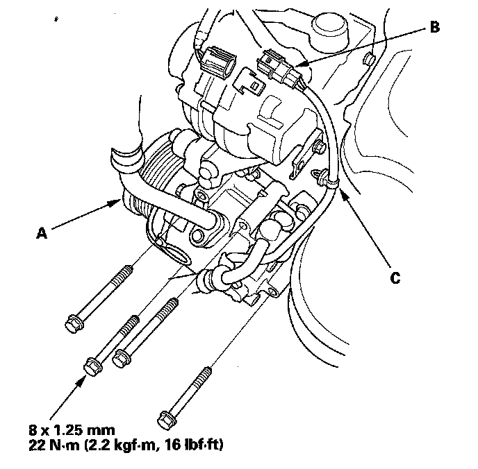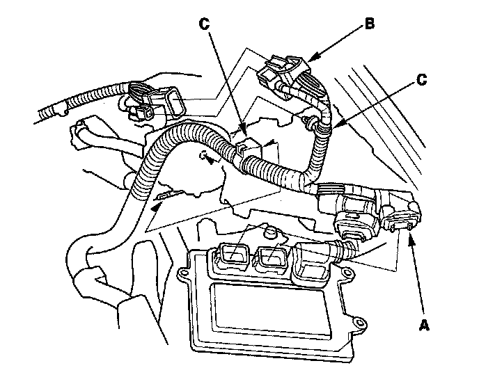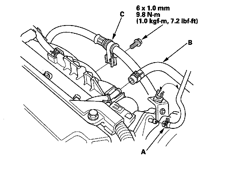 43. Install the vacuum hose (A), the brake booster vacuum hose (B), and the power steering (P/S) hose clamp (C).