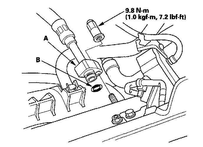 44. Install the fuel feed hose (A). Use new O-ring (B).