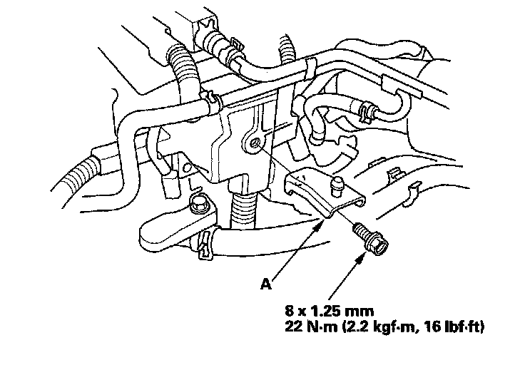 21. Install the steering gearbox stiffener (A), then tighten the steering gearbox mounting bolt and stiffener bolt.