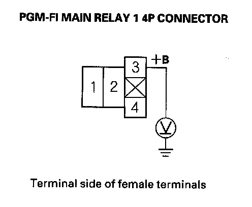 62. Measure voltage between PGM-FI main relay 1 4P connector terminal No. 1 and body ground.