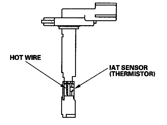 The mass air flow (MAF) sensor/intake air temperature (IAT) sensor contains a hot wire and a thermistor. It is located in the intake air passage. The resistance of the hot wire and thermistor changes due to intake air temperature and airflow. The control circuit in the MAF sensor controls the current to keep the hot wire at a set temperature. The current is converted to voltage in the control circuit, then output to the PCM.