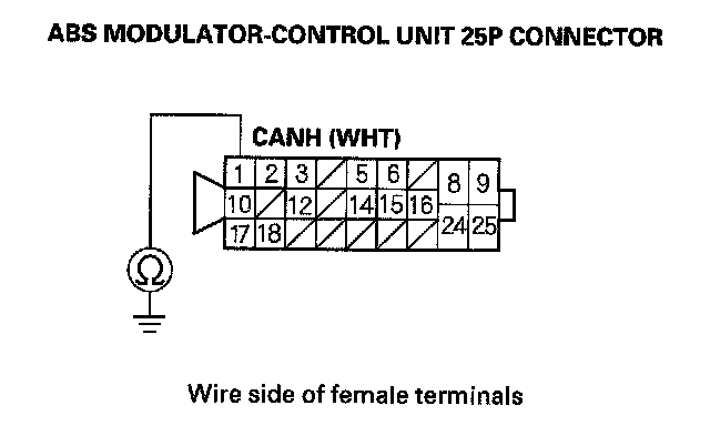 16. Check for continuity between ABS modulator control unit 25P connector terminal No. 17 and body ground.