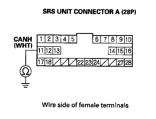 12. Check for continuity between SRS unit connector A (28P) terminal No. 11 and body ground.