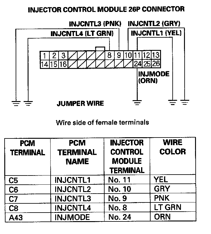10. Connect injector control module 26P connector terminals No. 8, No. 9, No. 10, No. 11, and No. 24 to body ground with a jumper wire (see table).