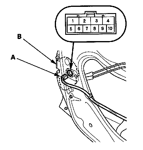 2. Disconnect the 10P connector (A) from the key cylinder switch (B).