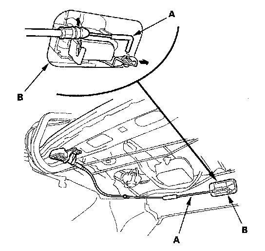 2. From the trunk, disconnect the seat-back release cable (A) from the seat-back latch (B).