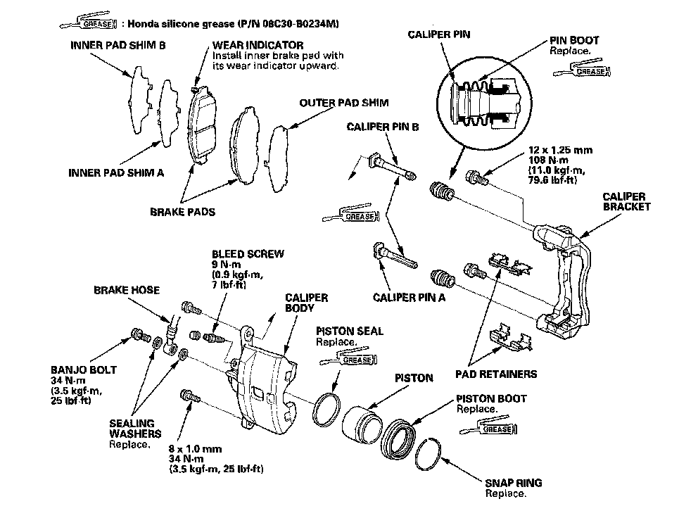 NOTE: Make sure that the caliper pins are installed correctly. Upper caliper pin B and lower caliper pin A are different. If the these caliper pins are installed in the wrong location, it will cause vibration, uneven or rapid brake pad wear, and possibly uneven tire wear.