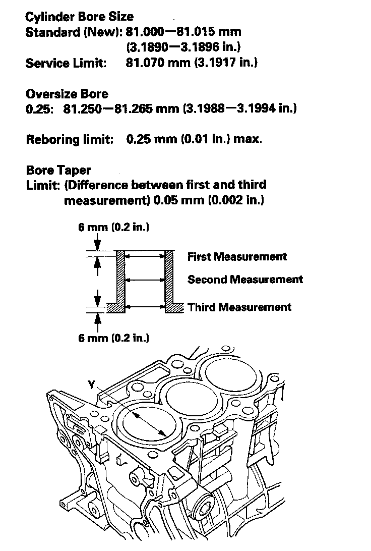 4. Measure the wear and taper Y at three levels inside each cylinder as shown. If the measurements in any cylinder are beyond the Oversize Bore Service Limit, replace the engine block. If the engine block is being rebored, refer to step 7 after reboring.