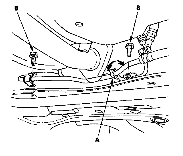 33. Unclamp the power steering fluid line clamp (A) on the front subframe, and remove the P/S line mounting bolts (B).