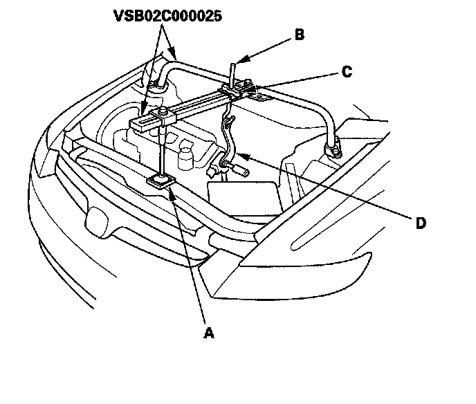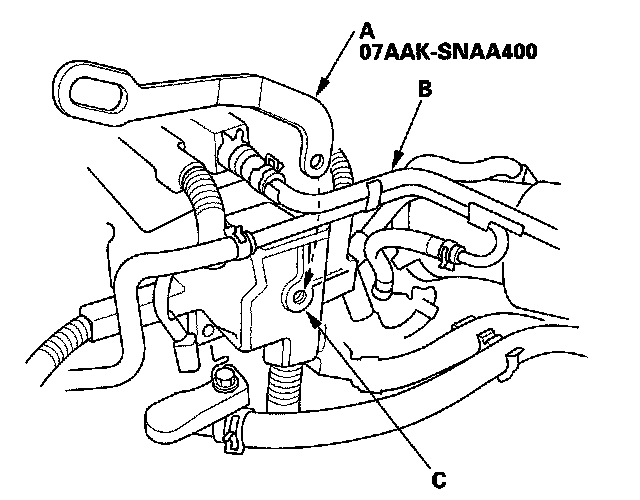 46. Install the evaporative emission (EVAP) canister hose (A), the brake booster vacuum hose (B), and the power steering (P/S) hose clamp (C).