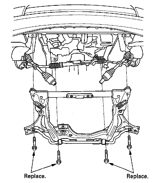 13. Align the front subframe reference marks (A) to the body (B), as noted during removal. Tighten the subframe mounting bolts to the specified torque.