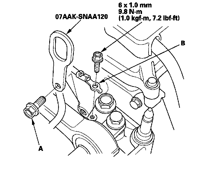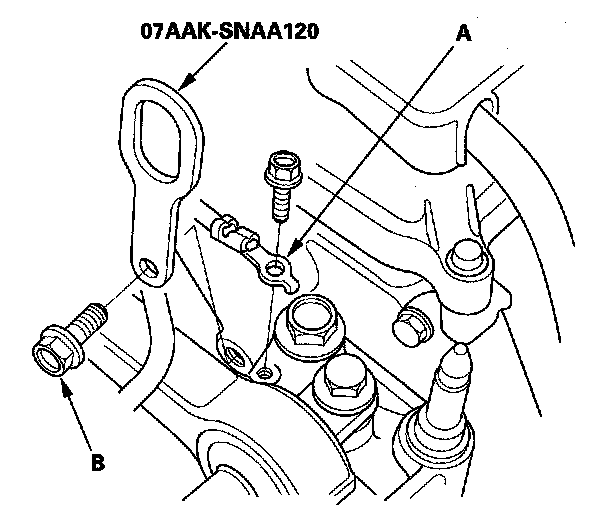 4. Attach the support eyelet (A) to the cylinder head with the support bolt (B). Tighten the bolt by hand.