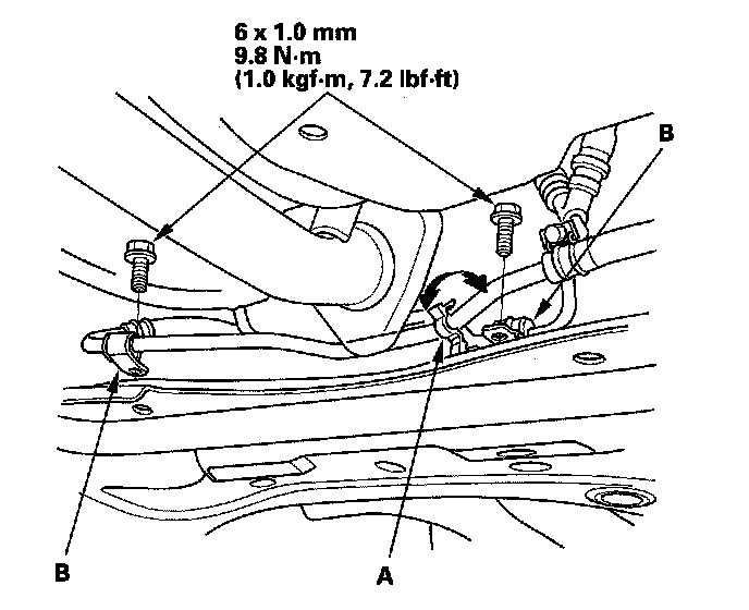 24. Install the power steering (P/S) line on the clamp (A), then install the P/S line brackets (B) on the subframe.