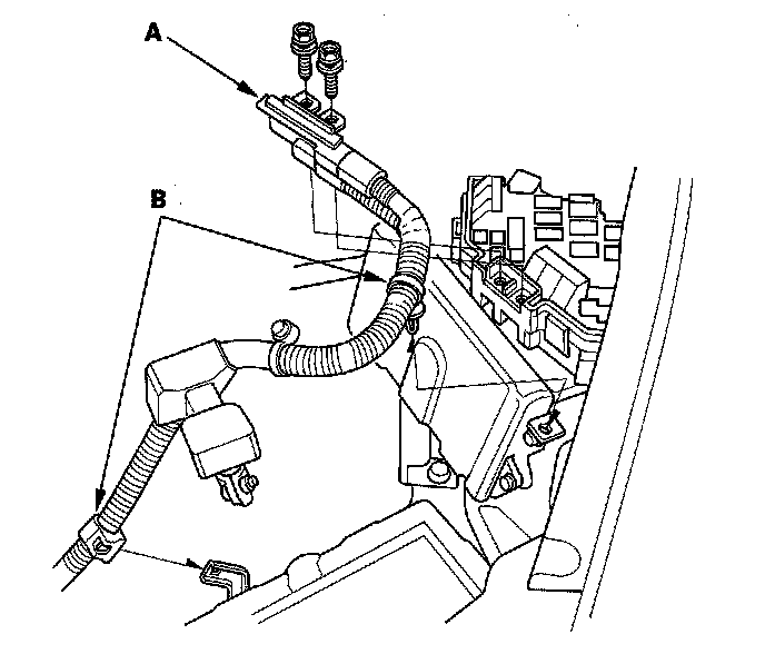 11. Remove the battery cables (A) from the under-hood fuse/relay box.