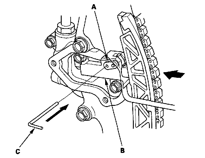 3. Align the holes on the lock (A) and the auto-tensioner (B), then insert a 1.0 mm (0.04 in.) diameter pin (C) into the holes. Turn the crankshaft clockwise to secure the pin.