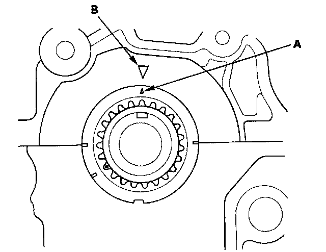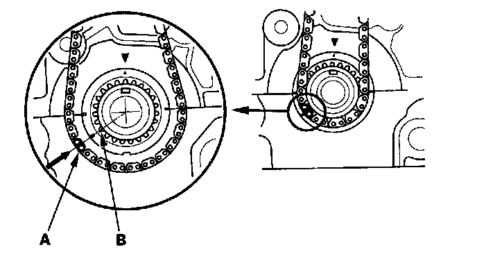 1. Set the crankshaft to top dead center (TDC). Align the TDC mark (A) on the crankshaft sprocket with the pointer (B) on the engine block.