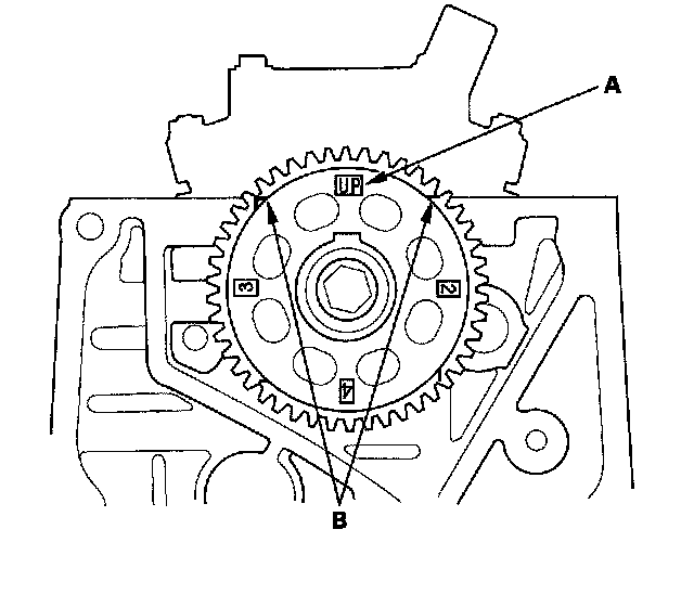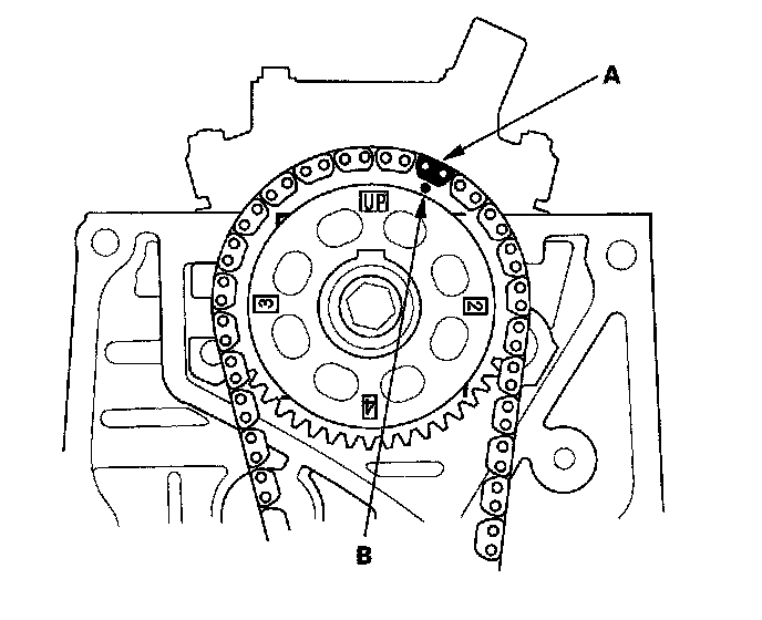 2. Set the camshaft to TDC. The "UP" mark (A) on the camshaft sprocket should be at the top, and the TDC grooves (B) on the camshaft sprocket should line up with the top edge of the head.