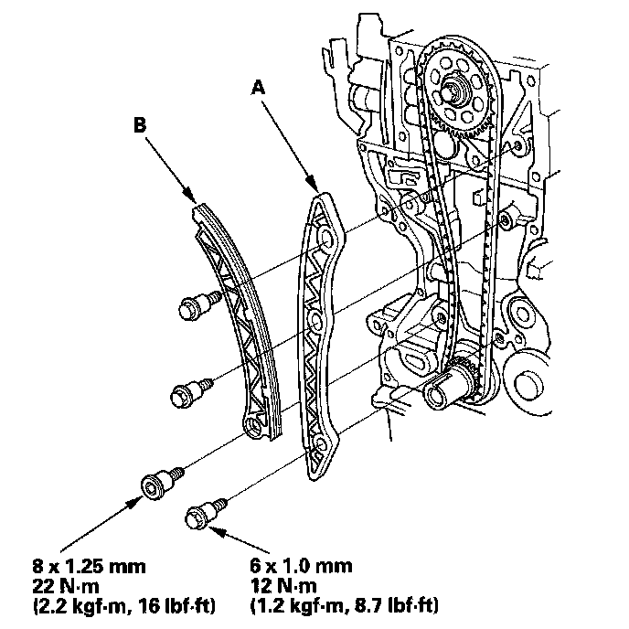 5. Install the cam chain guide (A) and cam chain tensioner arm (B).