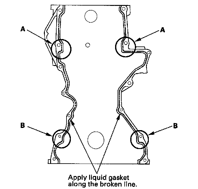 12. Apply liquid gasket to the engine block upper surface contact areas (A) on the oil pump and lower block upper surface contact areas (B) on the oil pump.