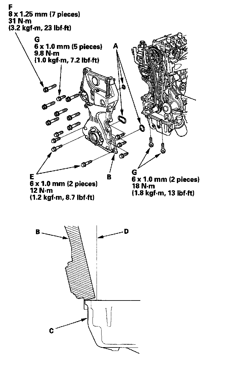 14. Install new O-rings (A) on the oil pump. Set the edge of the oil pump (B) to the edge of the oil pan (C), then install the oil pump on the engine block (D). Loosely install the dowel bolts (E), then tighten the 8 mm bolts (F). Tighten the 6 mm bolts (G) and dowel bolts. Wipe off the excess liquid gasket on the oil pan and oil pump mating area.