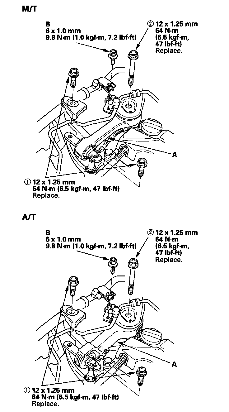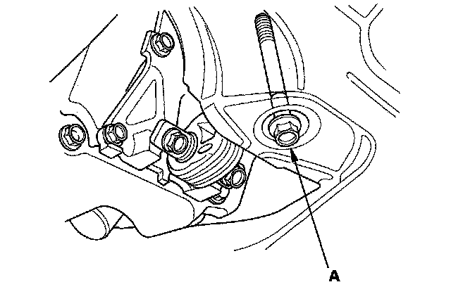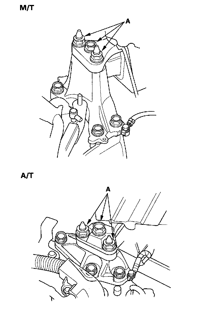 18. Loosen the transmission mounting bolt and nuts (A).