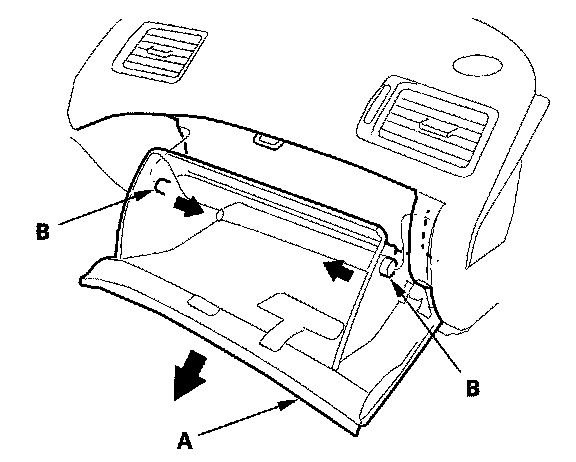 1. While holding the glove box (A), release the glove box stop (B) on each side from the dashboard by pushing them inside.