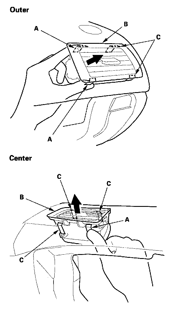 2. Push on the side hooks (A) by hand to release them. Gently pull out the side vent (B) to release the other hooks (C), then remove the passenger's vent.