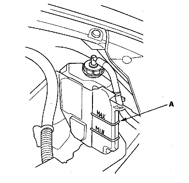 8. Fill the reserve tank to the MAX mark (A) with Honda Long Life Antifreeze/Coolant Type 2 (P/N 0L999-9001).
