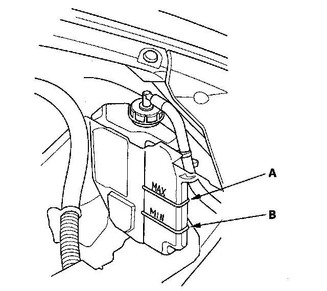 Coolant Check1. Look at the coolant level in the coolant reservoir. Make sure it is between the MAX mark (A) and MIN mark (B).