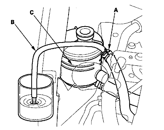 3. Start the engine, let it run at idle, and turn the steering wheel from lock-to-lock several times. When fluid stops running out of the hose, shut off the engine. Discard the fluid.