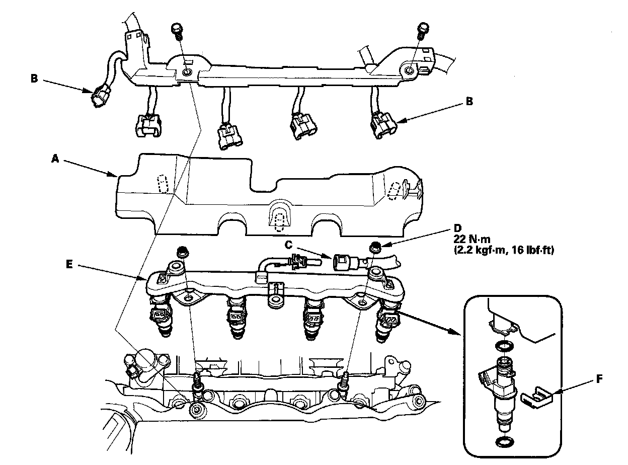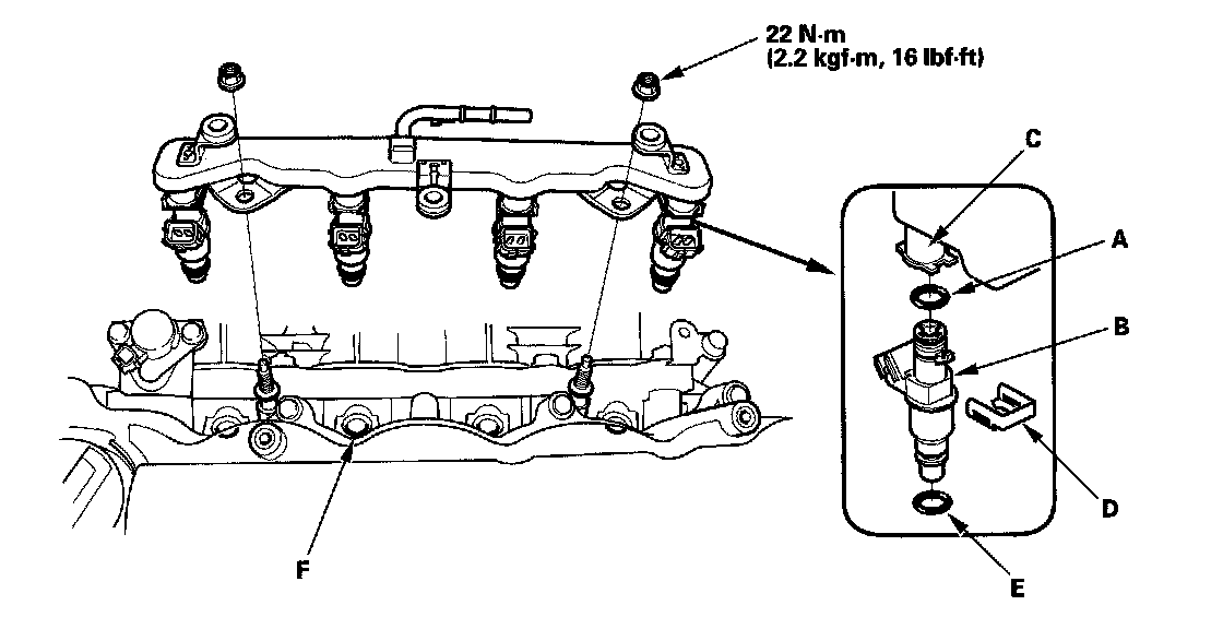12. Install the fuel rail and the injector into the cylinder head (F).
