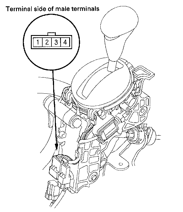 3. Shift out of the P position, and check for continuity between connector terminals No. 3 and No. 4. There should be continuity.