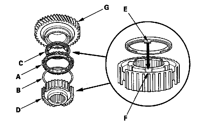 4. Align the fingers (E) on the friction damper with the grooves (F) on the 1st/2nd synchro hub, then install the 1st gear (G) onto the 1st/2nd synchro hub.