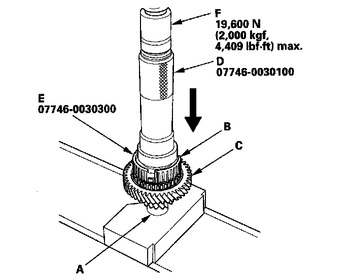 6. Support the countershaft (A) on steel blocks, then install the 1st/2nd synchro hub (B) with 1st gear (C) using the 40 mm I.D. driver (D), 30 mm I.D. attachment (E), and a press (F).