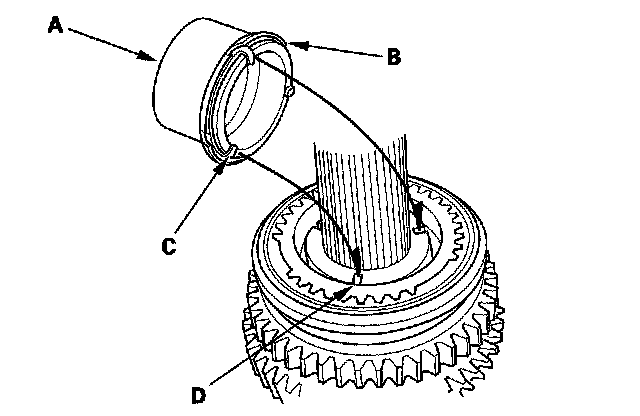 8. Install the distance collar (A) and friction damper (B), by aligning the friction damper fingers (C) with the 1st/2nd synchro hub grooves (D).