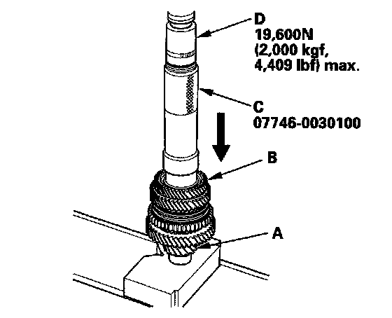 11. Install 4th gear (A) using the 40 mm I.D. driver (B) and a press (C).