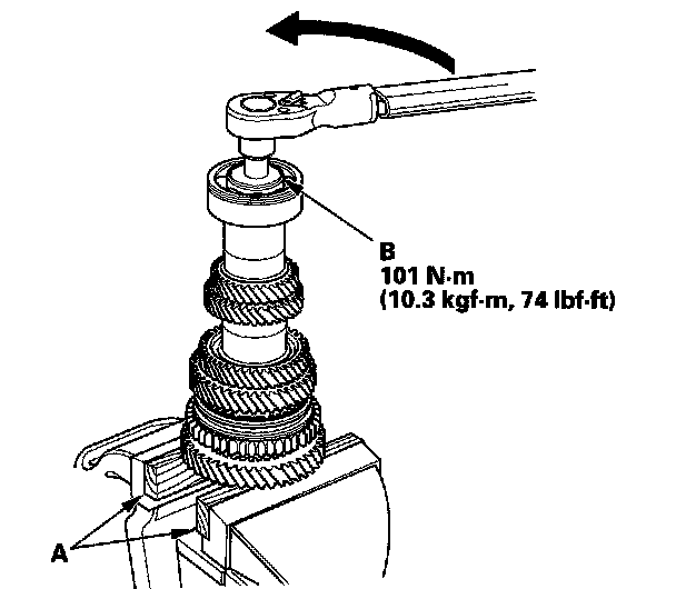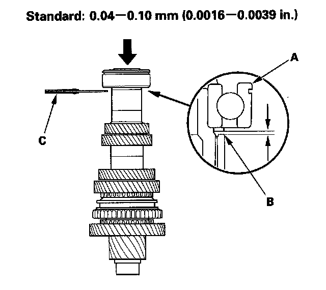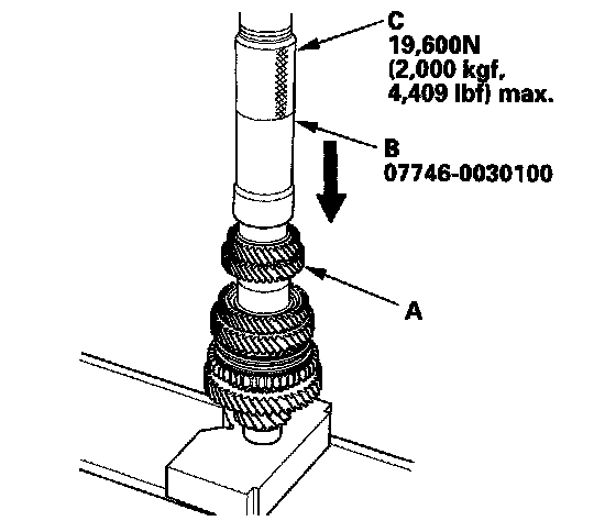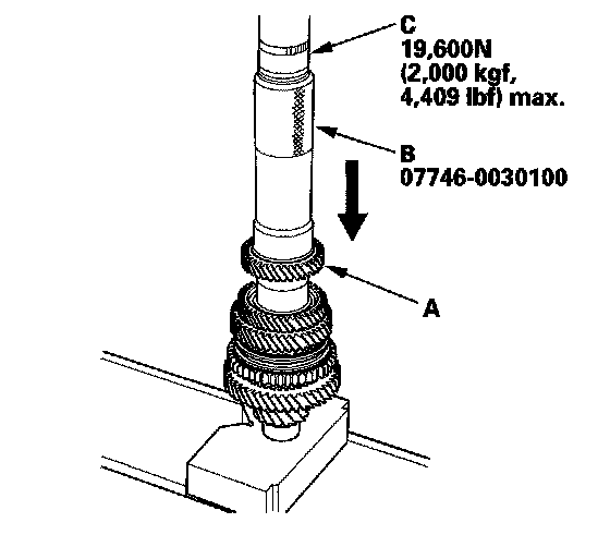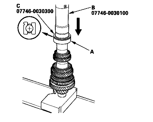 12. Install 5th gear (A) using the 40 mm I.D. driver (B) and a press (C).