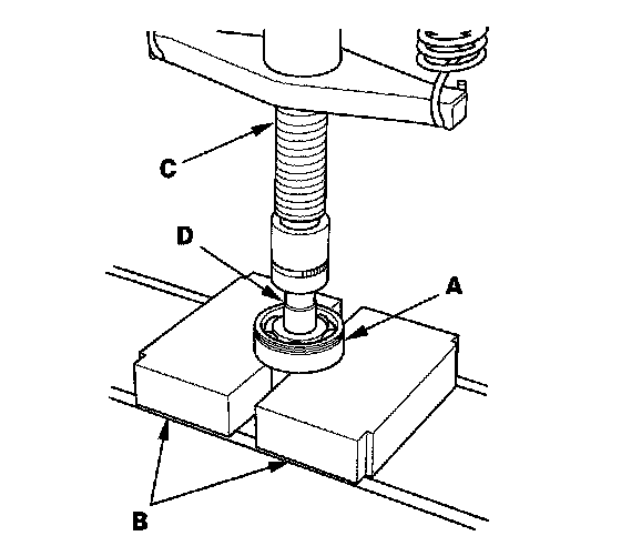17. Support ball bearing (A) on steel blocks (B), then use a press (C) and an attachment (D) to press the countershaft out of the ball bearing.