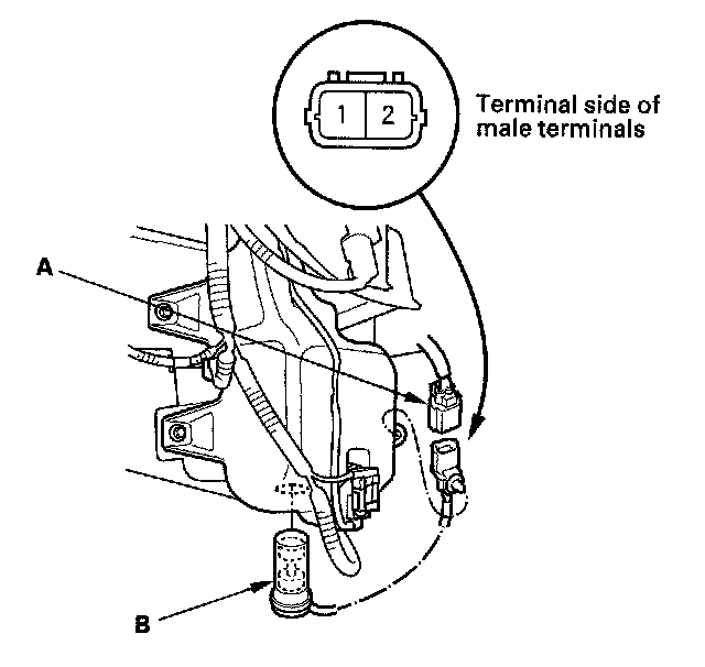 2. Disconnect the 2P connector (A) from the washer fluid level switch (B).