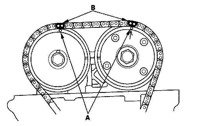 3. Install the cam chain on the crankshaft sprocket with the colored link plate (A) aligned with the mark (B) on the crankshaft sprocket.